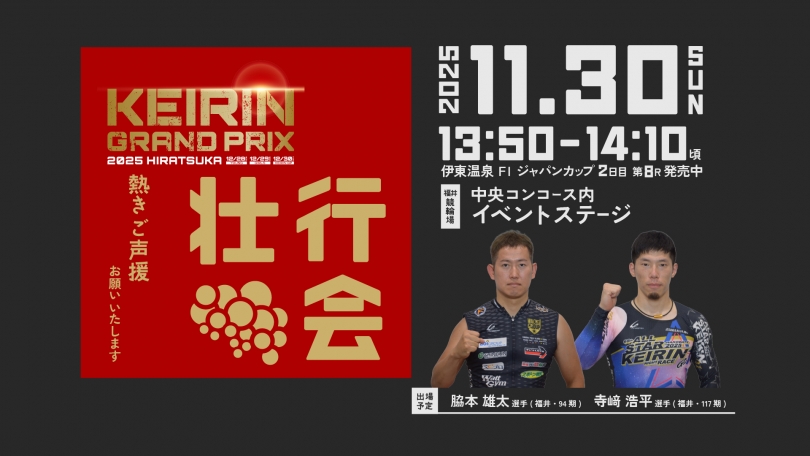 お知らせ TOP お知らせ 緊急・重要 【11/30】KEIRINグランプリ2025壮行会(脇本雄太選手、寺崎浩平選手) 【11/30】KEIRINグランプリ2025壮行会(脇本雄太選手、寺崎浩平選手) 緊急・重要 2025.11.21 KEIRINグランプリ2025に出場予定の脇本雄太選手と寺崎浩平選手の壮行会を開催いたします。 皆さまのご来場を心よりお待ちしております。 ■KEIRINグランプリ2025出場予定選手 ・脇本雄太(福井・94期) ・寺崎浩平(福井・117期) ■壮行会日時 令和7年11月30日(日) 13:50~14:10 ※伊東温泉FⅠジャパンカップ 第8R発売中 ■壮行会場所 福井競輪場 中央コンコース内イベントステージ 前の記事 一覧に戻る 次の記事